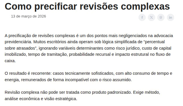 Nesse modelo, o advogado não “resolve um benefício”. Ele constrói estratégia previdenciária.